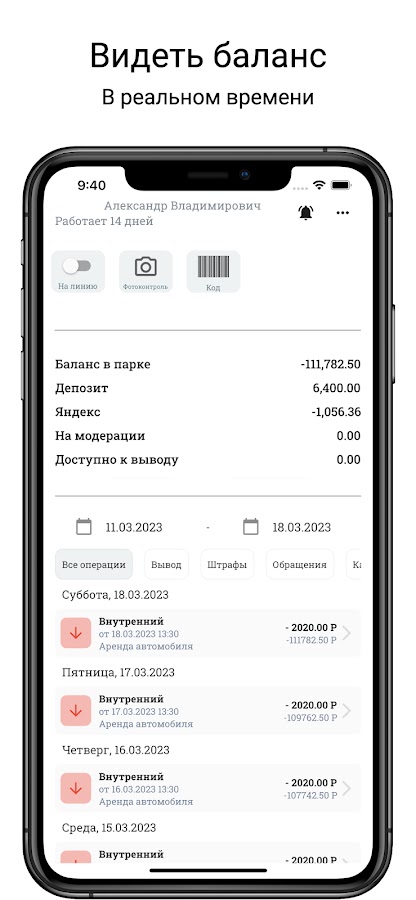 Приложение в реальном времени позволяет отслеживать баланс счета и операции по балансу, такие как поездки, заказы или штрафы