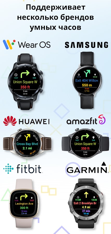 Приложение Navigation Wear совместимо ТОЛЬКО с Samsung, Wear OS, Huawei, Fitbit, Garmin и смарт-часы Amazfit. Для этого требуется бесплатное приложение-компаньон «Navigation Wear», установленное на смарт-часах.