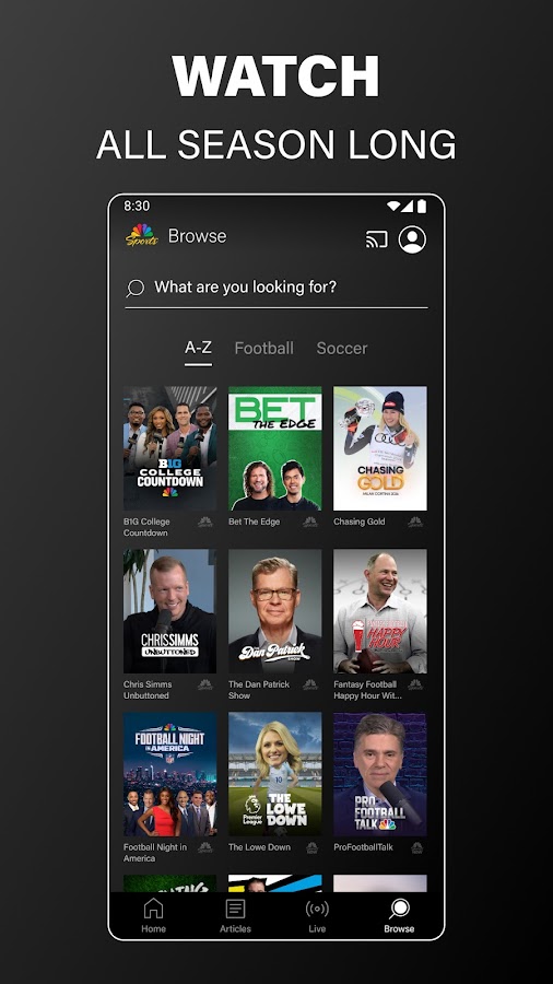 Смотрите тысячи спортивных событий в прямом эфире, а также последние выпуски ваших любимых телешоу NBC в любое время с помощью приложения NBC Sports! Смотрите трансляции ведущих лиг и событий в прямом эфире на NBC Sports, включая: