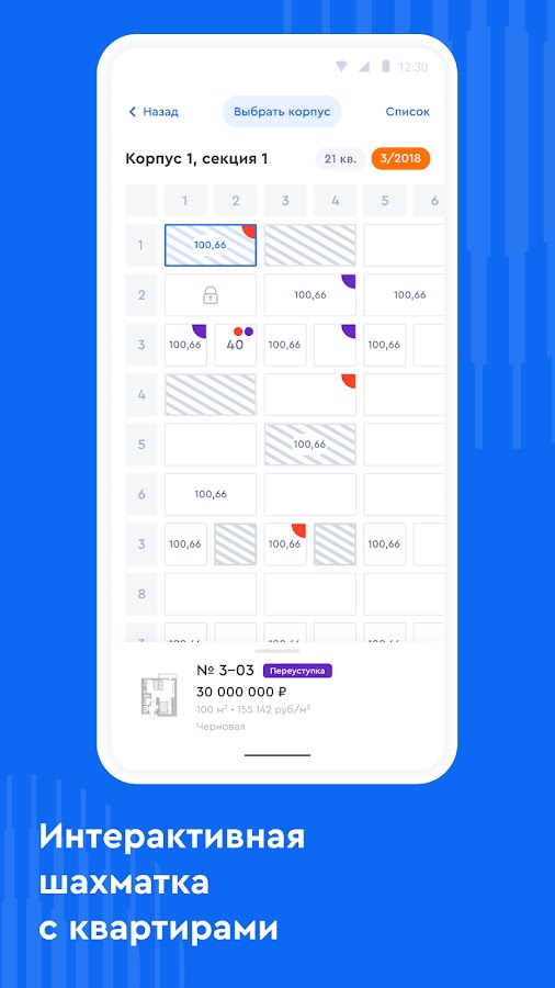 • Интерактивная шахматка. Просмотр квартир в привычном вам виде теперь и на мобильных.