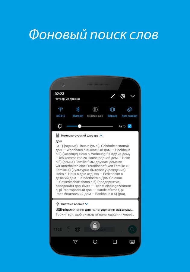 Надоело таскать с собой большие и тяжелые словари? Теперь всё необходимое будет у вас в смартфоне! Немецко-русский и русско-немецкий оффлайн-словари будут всегда с вами, где бы вы ни были — на учебе, в путешествиях или занимаясь немецким в домашней обстановке. При первом запуске словаря будет загружен архив с базой данных.