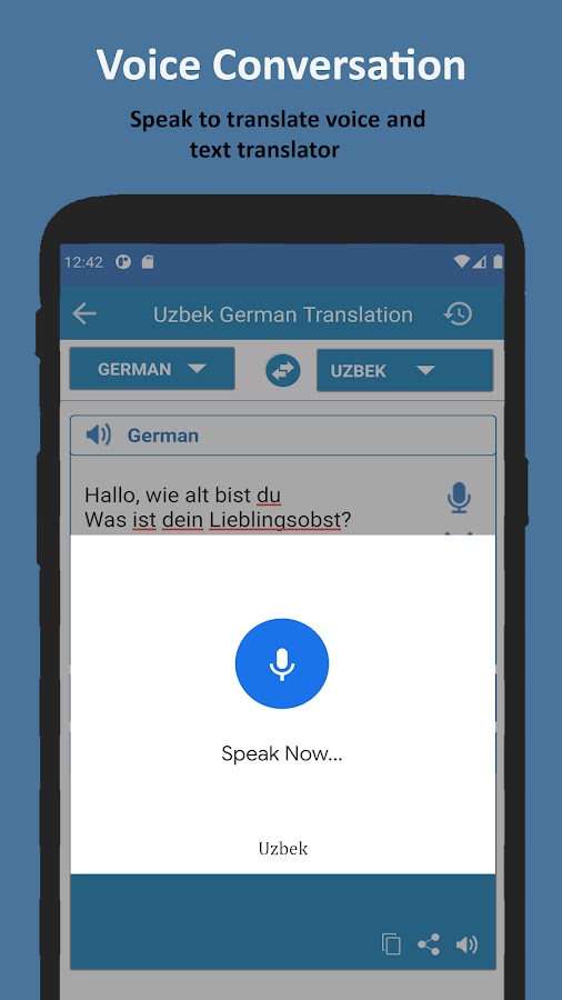 German Uzbek Translator and dictionary, including speaking and translate option, makes it very easy, fast, and accurate your desired translation. If you feel difficulty in writing the text, then a German Uzbek Translator and dictionary brings a speak option for you to speak the sentence by clicking the microphone icon for the voice translation.
