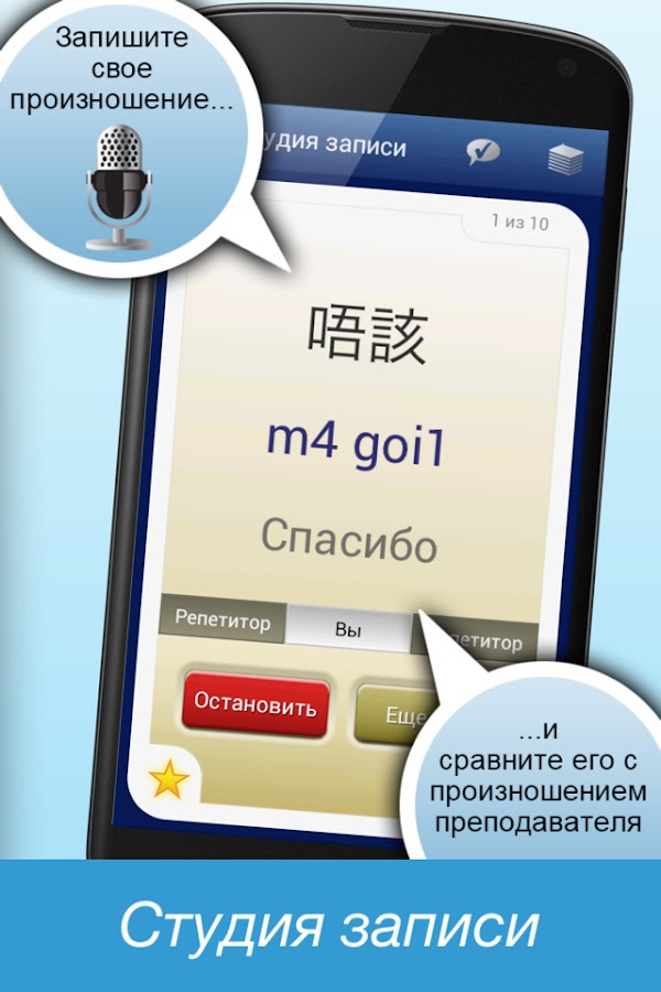 Это приложение для изучения кантонского языка полностью доступно на русском языке и 10 других языках.