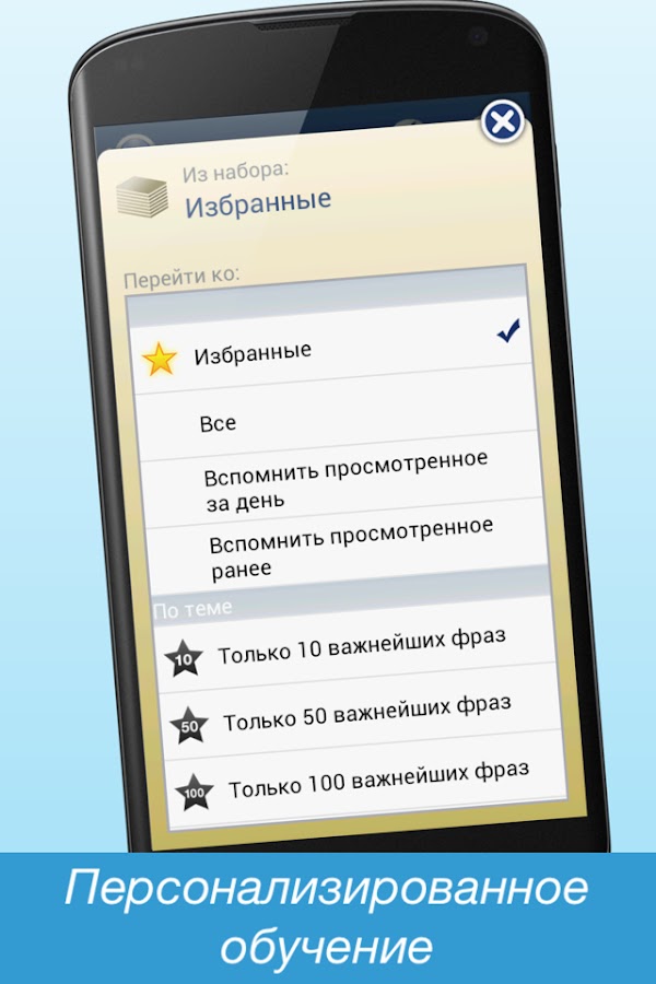 В «Избранное» можно добавить любую карточку. Это позволяет составить пользовательскую колоду карточек для изучения нужных слов в течение дня. Включите режим «Повтор» и повторите все, что вы выучили за день, увеличив тем самым объем отложившегося в памяти материала.
