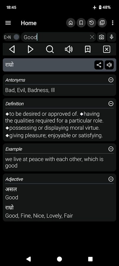 Ознакомьтесь с полным, оффлайн и бесплатным словарем с непальского на английский и с английского на непальский. Этот универсальный инструмент создан для того, чтобы сделать поиск слов простым и эффективным, независимо от того, находитесь ли вы в сети или офлайн. Это приложение, созданное для удобства и обучения, идеально подходит для студентов, специалистов и всех, кто хочет преодолеть разрыв между непальским и английским языками.