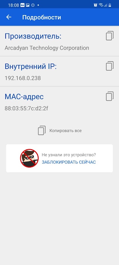 Просмотрите подробную информацию о каждом устройстве, такую как: имя, производитель, IP и MAC-адрес.