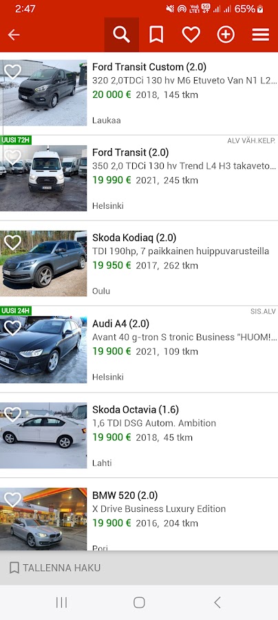Nettiauto — самая популярная в Финляндии авторынка, где можно найти все подержанные и новые автомобили. Легко покупайте, продавайте и обменивайте автомобили. В приложении Nettiauto вы можете искать все подержанные и новые автомобили, выставленные на продажу на Nettiauto, используя точные критерии поиска, сохранять избранные поисковые запросы и отмечать интересные объявления в списке избранного. Каждый автомобиль, выставленный на продажу, содержит от 1 до 24 фотографий, подробную техническую информацию и контактную информацию продавца. Вы также можете прочитать вопросы, заданные продавцу, увидеть местоположение продавца на карте и отправить ему личные сообщения. Войдите в свою учетную запись Alma, чтобы оставлять и управлять своими объявлениями, а также отвечать на сообщения.