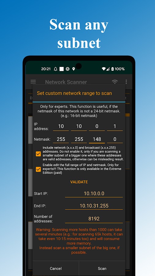 * Сканирование настраиваемых сетевых диапазонов, изменение маски подсети, расчет сетевого диапазона