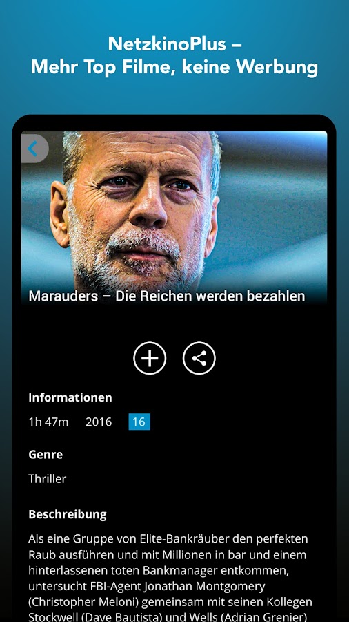 Netzkino — это САМОЕ приложение для киноманов и всех, кто хочет ими стать: здесь вы можете транслировать около 2500 фильмов всех жанров в любое время и в любом месте. Бесплатно и без регистрации!