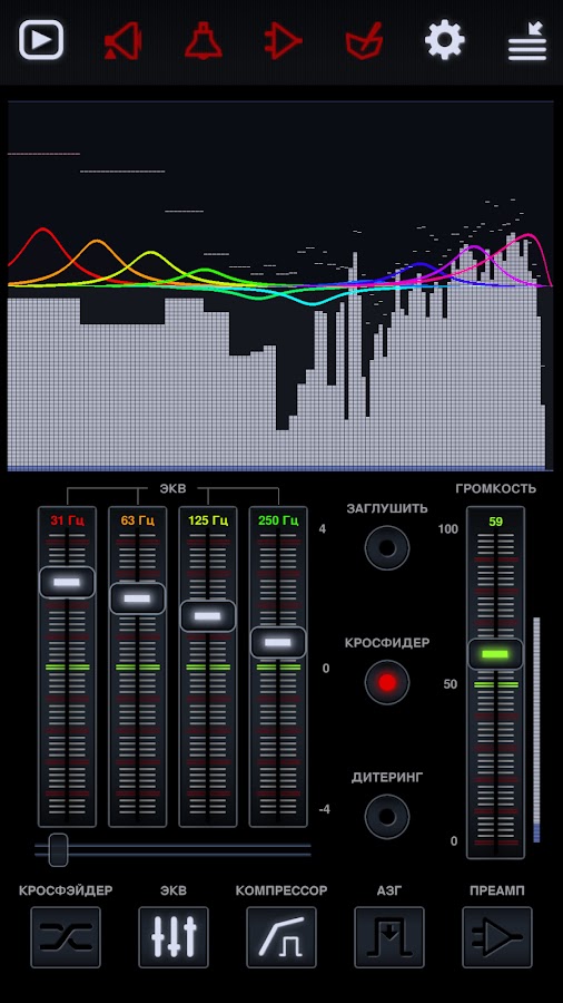 — Параметрический Эквалайзер (4-60 полосный, полностью настраиваемый: тип, частота, Q, громкость)