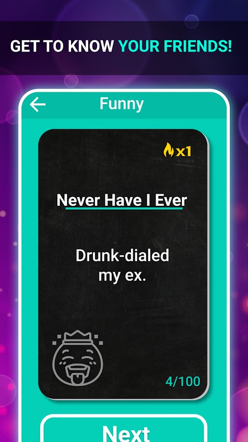 Эта захватывающая игра на выпивку предназначена для групп и гарантирует незабываемые моменты. С Never Have I Ever вы сможете насладиться тысячами вопросов и фраз, которые приведут вас в неожиданные ситуации. Это идеальная игра для вечеринок, гарантирующая, что смех никогда не прекратится. От смелых вопросов до веселых сценариев, каждый раунд — это новое приключение, которое обогатит ваше времяпрепровождение вместе.