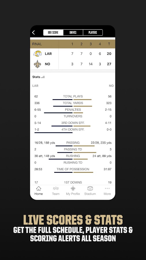 Это официальное мобильное приложение New Orleans Saints. Вы можете использовать его, чтобы быть в курсе последних новостей команды, смотреть интервью в прямом эфире, погружаться в расширенную статистику игровых дней, с легкостью управлять своими игровыми билетами и многое другое!