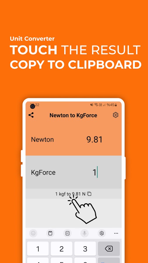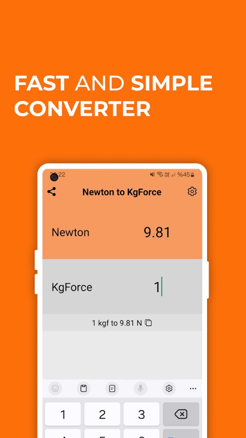 ⚡ **Процесс конвертации без усилий:** Использовать наше приложение так же просто, как 1-2-3. Просто коснитесь поля ввода «Ньютон», введите свое число и посмотрите, как оно мгновенно преобразуется в килограмм-силу. Аналогичным образом коснитесь поля ввода «Килограмм-сила», введите свое число и увидите, как оно быстро преобразуется в Ньютоны.