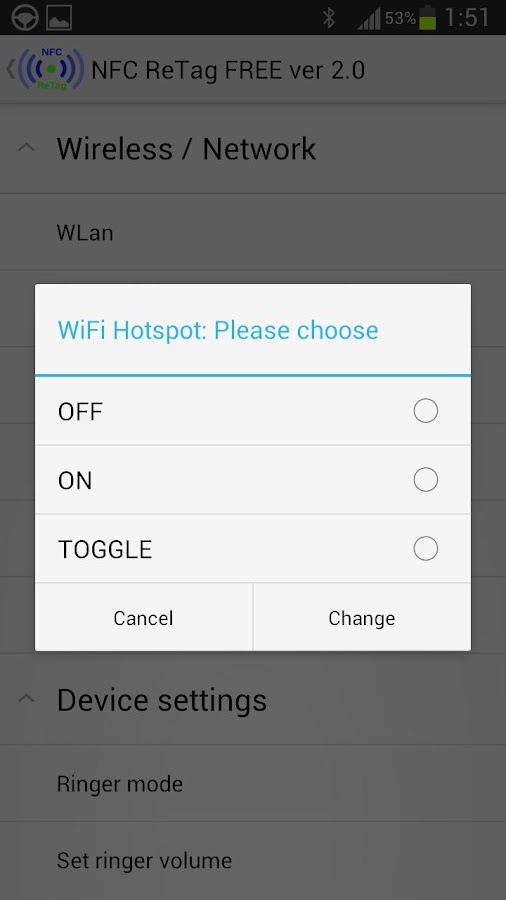 Вы можете использовать это приложение, чтобы связать несколько функций (например, Wlan OFF, ON Bluetooth, Mobile Data Toggle, начать навигацию, запустить Tasker задачи, запуск любого установленного приложения, использовать мультимедийные кнопки, позвонить по телефонному номеру, добавлять метки, записи календаря, добавьте Текст в речь и многое другое!) к NFC тегов через приложение внутренней базе данных. Вы даже можете добавить тег циклов, и пусть ваши теги запускать различные мероприятия в сканировании.