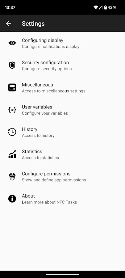Помимо запуска задач, это приложение также позволяет Вам работать с рядом настроек, таких как пользовательские переменные, разрешения, параметры безопасности и уведомлений, а также многое другое.