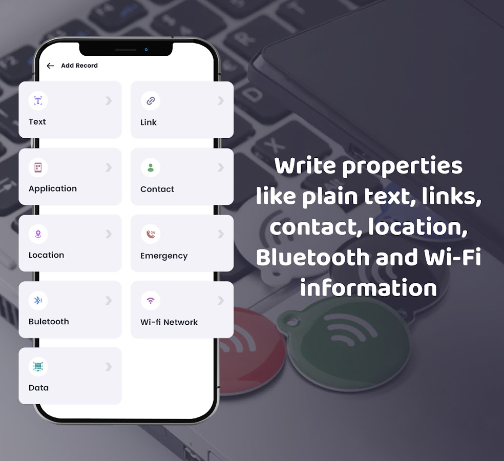 Создавайте пользовательские записи (текст, URL, контакты, SMS, электронная почта, Bluetooth, WiFi, запуск приложения и многое другое)