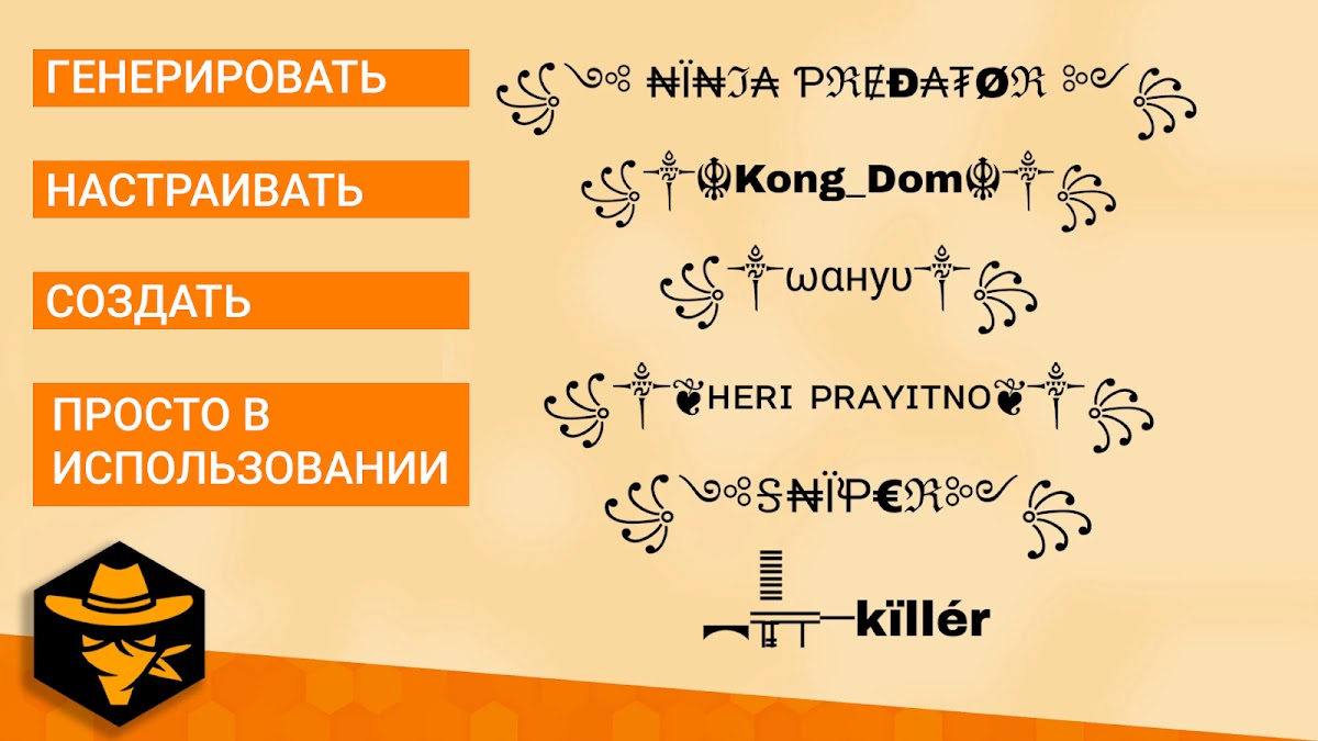 Приложение The Symbols Creator ⚡ Генератор псевдонимов для геймеров генерирует массу интересных результатов для геймеров. Основные особенности включают в себя: