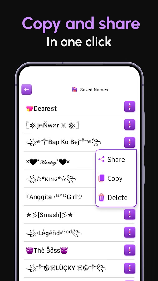 Улучшите свой никнейм с помощью Stylish Nickname Generator!Создайте крутые никнеймы с помощью лучшего приложения для создания стильных имён! С Nickname Generator: Stylish Text возьмите под контроль свою онлайн-идентичность и выразите себя. Наше приложение Nickname Maker: Cool Fonts Symbols предоставляет безграничные возможности для создания уникального и запоминающегося прозвища. От милых до крутых — в нём есть всё. Окунитесь в атмосферу веселья и начните создавать идеальное прозвище в стиле для вашего следующего игрового приключения!
