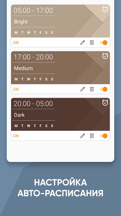 ⏰ Автоматическое включение фильтров — Выберите время включения и выключения ночного режима. Вы можете быть уверены, что фильтр синего света будет всегда включен ночью. Вам не нужно будет беспокоиться, если Вы вдруг забыли включить его.