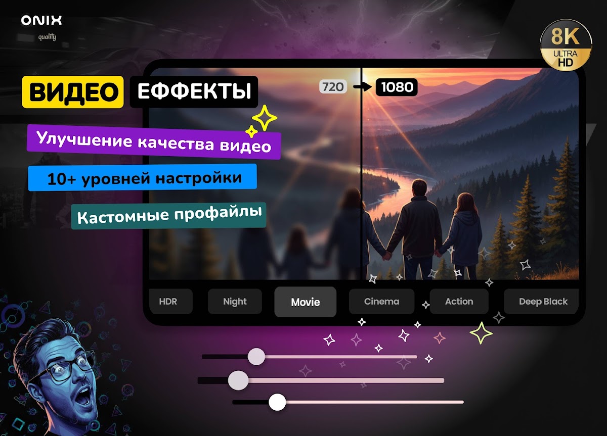 Динамическое выравнивание и ночной режим< — больше никаких тихих шёпотов или громких взрывов Чистый голос — изоляция человеческого голоса и шумоподавление Идеально для наушников, ночного просмотра, ТВ-приставок и киноманов, которые ценят чистый, качественный и сбалансированный звук. 🎨 ЭКСКЛЮЗИВНЫЕ ВИДЕОЭФФЕКТЫ, ФИЛЬТРЫ И УЛУЧШЕНИЕ КАЧЕСТВА Усилитель качества видео — делает 720p почти как 1080p (зависит от устройства) Более 10 настраиваемых параметров: яркость, контраст, насыщенность, яркость цвета, резкость, цветокоррекция, оттенок и другие Пользовательские пресеты эффектов — создавайте и сохраняйте любимые настройки Обработка в реальном времени на GPU — плавная работа даже на слабых устройствах з 1 гб ОЗУ Трансформируйте ваши видео с профессиональной цветокоррекцией и динамической настройкой видео. 📂 МЕДИА И ГАЛЕРЕЯ Приватная папка — хранилище видео с PIN Избранное и История — быстрый доступ к вашему контенту Создание плейлиста — организуйте ваши фильмы или IPTV каналы Автоматическое сканирование папок — находит все видео на телефоне, SD-карте, внешних HDD ⚡ ВЫСОКАЯ ПРОИЗВОДИТЕЛЬНОСТЬ И СОВРЕМЕННЫЙ ДИЗАЙН (Видеоплеер Всех Форматов) Быстрый и лёгкий видеоплеер с аппаратным ускорением для ультраплавного воспроизведения Режим «Картинка в картинке» Управление жестами для яркости, громкости, перемотки и зума видео 🎯 ЛУЧШИЙ ВИДЕОПЛЕЕР ДЛЯ: Любителей кино и IPTV: наслаждайтесь естественным звуком с чётким голосом и лучшим качеством изображения Ценителей качества: улучшайте изображение и звук с помощью улучшения на основе ИИ Пользователей планшетов: оптимизированный видеоплеер для планшетов с идеальным сенсорным управлением и поддержкой больших экранов Всех: простой, мощный видеоплеер без рекламы и лишнего мусора ⚙️ КАК ЭТО РАБОТАЕТ Night Video Player в реальном времени улучшает видео и звук, усиливает голос и балансирует громкость. Результат: ваши видео выглядят чётче, звучат лучше и воспроизводятся плавнее. 🔒 ПРИВАТНОСТЬ Без рекламы, без аналитики, без подозрительных разрешений. Ваши медиа остаются вашими — полностью приватными и защищёнными. ⭐ Попробуйте самый продвинутый видеоплеер с умной нормализацией звука, эксклюзивными видеоэффектами и поддержкой всех форматов.