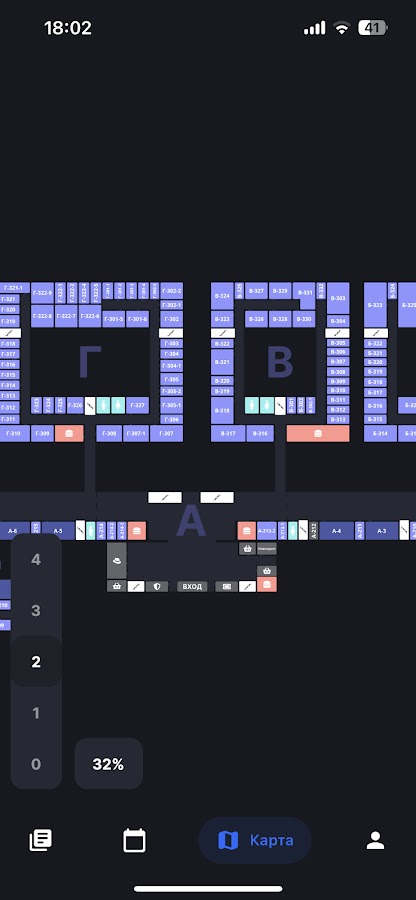 Схема университета, на которой отмечены важные объекты в здании. Например, магазины и столовые.