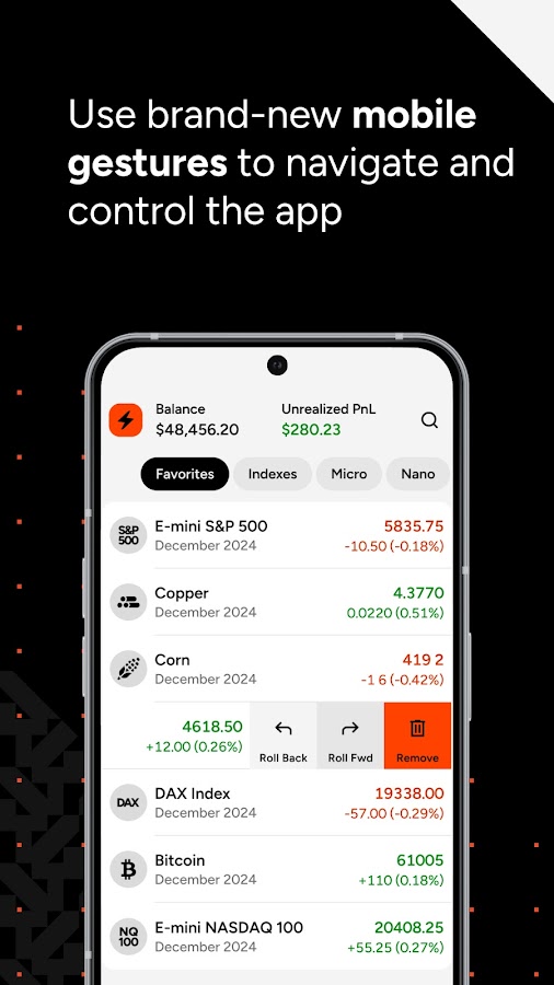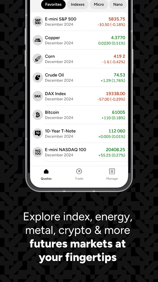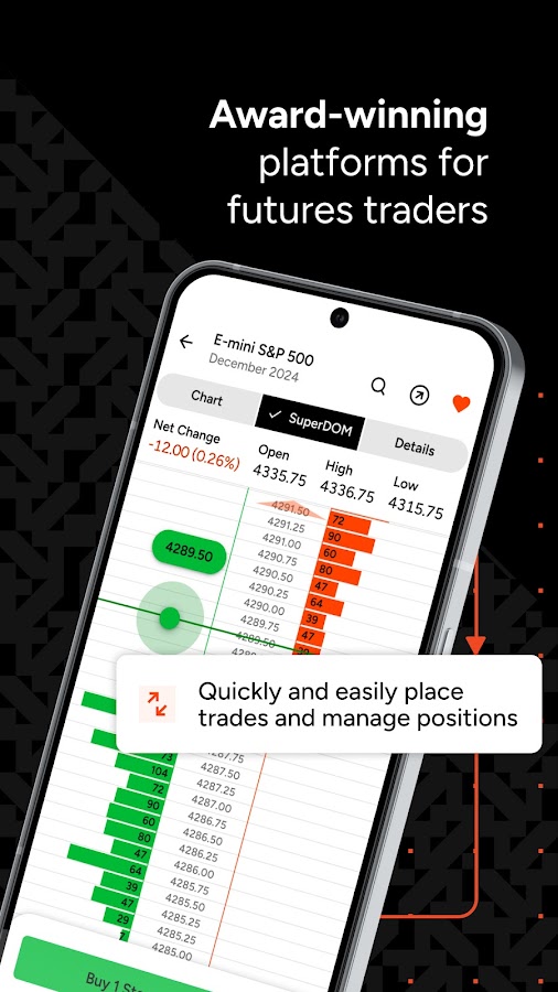 Загрузите сегодня лучшего брокера фьючерсов, чтобы торговать фьючерсами, отслеживать позиции в режиме реального времени и уверенно управлять своим портфелем — в любое время и в любом месте.