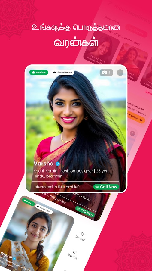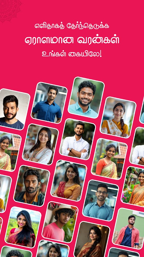 Начните поиск партнера для тамильского сообщества с помощью нашей платформы для поиска партнера для тамильского сообщества, где традиционный тамильский гороскоп сочетается с современными удобствами. Наши тамильские брачные услуги — это не просто комплексный подход, но и бесплатный тамильский брачный центр, призванный объединять сердца и отмечать наше богатое культурное наследие.
