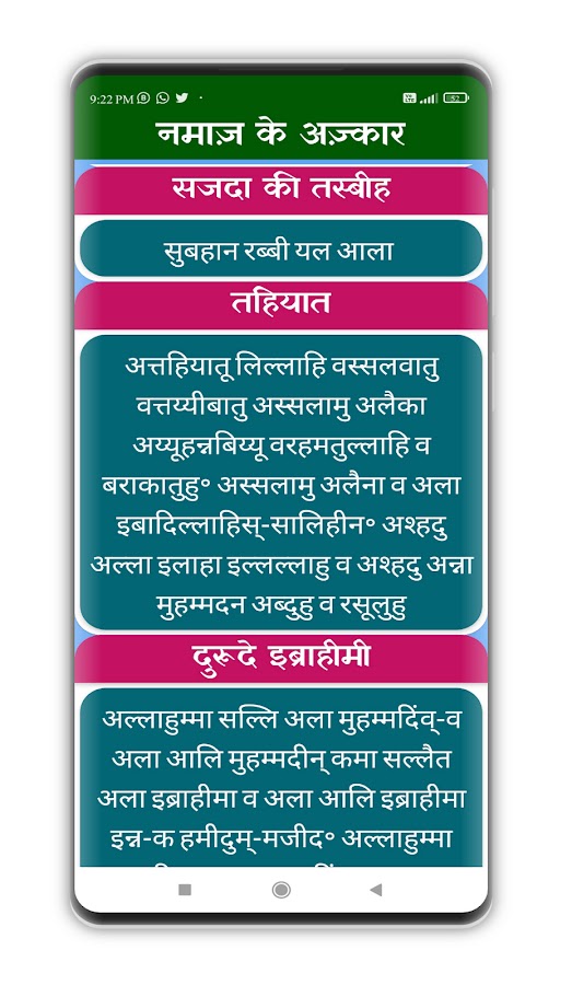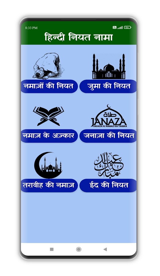 После установки этого приложения вы сможете читать ният нама китаб (नियत नामा किताब) на языке хинди. Если вы ищете намаз ка тарика на хинди «नमाज़ का तरीका» и хотите выучить джума ки ният, эйд ка тарика и джаназа ки дуа, чем установите это приложение. В это красивое приложение включены все вышеперечисленные ният, тарика и дуа.