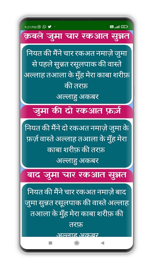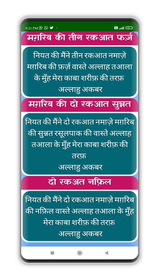 सभी नमाजों की नियत के लिए यह एक लाभदायक मोबाइल एप्लिकेशन है। इस में आप पंज वक्ता नमाज़, जुमा नमाज़, जनाज़ा नमाज़, ईदैन की नमाज़ वग़ैरा के अज़्कार, नियत और दुआ शामिल हैं। यह एक फ्री एप्लिकेशन है जिसको हिन्दी पढ़ने वाले लोगों के लिए विकसित किया गया है। इसमें लिखी तमाम बातें एक मिस्बाही आलिमे दीन (फ़ाज़िले अशरफ़ीया, मुबारकपुर) की इसलाह के बाद ही शामिल की गई हैं।
