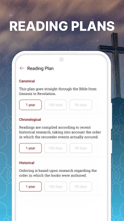 Эта функция позволяет вам планировать, как читать New Living Translation Bible через 90 дней, 180 дней или 1 год. Другие варианты включают чтение текстов в каноническом, хронологическом или историческом порядке.