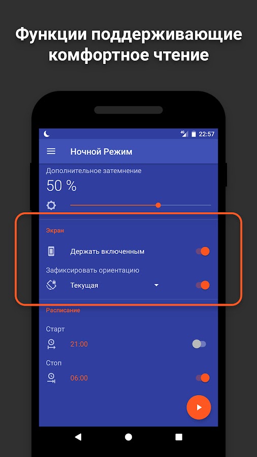 При использовании вашего устройства ночью или вечером, даже минимальная яркость экрана сильно утомляет глаза. Переключитесь на Ночной Режим чтобы включить дополнительное снижение яркости специальным фильтром затемнения так же как и фильтром синего света.