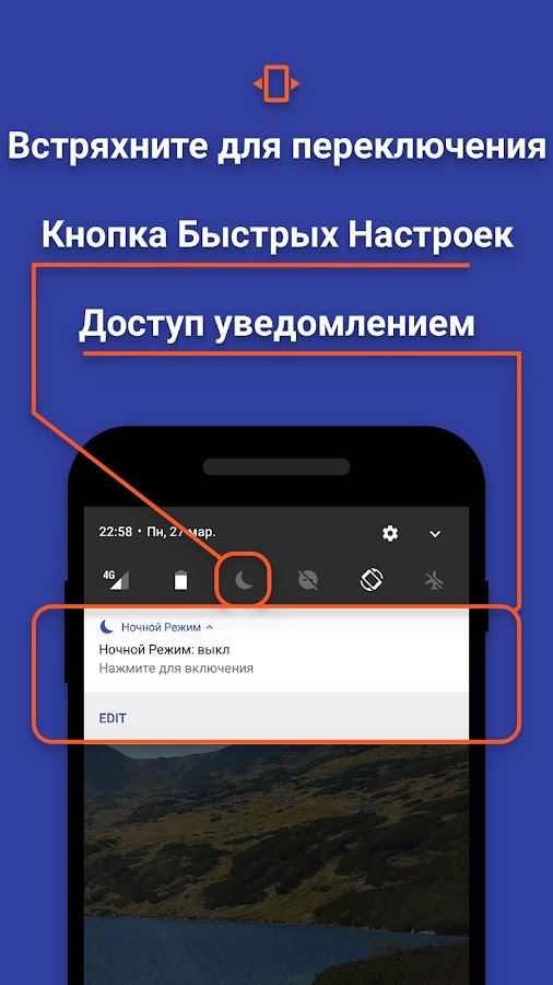 Просто встряхните ваше устройство для включения или отключения Ночного Режима (эта дополнительная функция включается в настройках приложения).