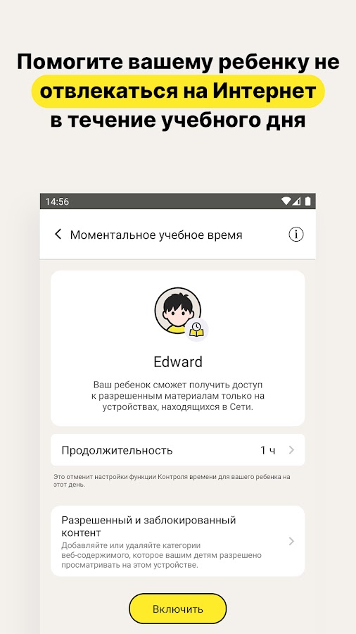 • Помогает родителям управлять средой дистанционного обучения ребенка, чтобы помочь ему сосредоточиться на учебе в течение дня.