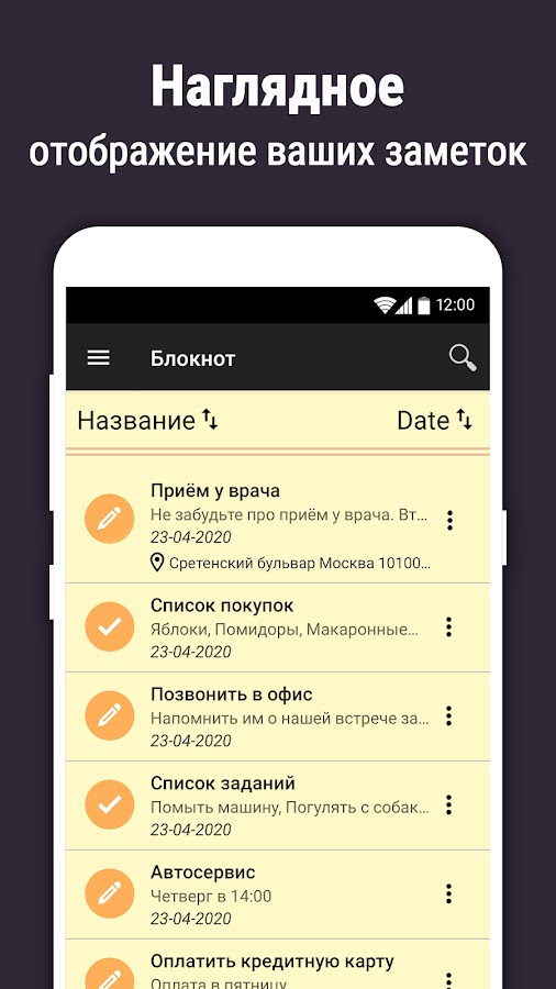 • Составление наглядно представленных заметок с возможностью сортировки по времени или названию.