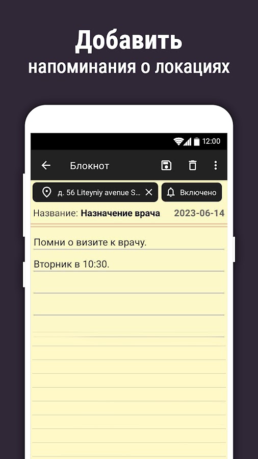 Получайте напоминания о своих заметках, когда вы оказываетесь в определённом месте! Когда вы пишете заметку, вы можете прикрепить к ней любую локацию. Это может быть, к примеру, записка, напоминающая вам купить что-то в супермаркете, в которой вы указали адрес супермаркета в качестве локации. Когда вы приблизитесь к этому месту, на вашем экране появится полезное напоминание о заметке.