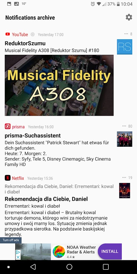 В архив хранятся уведомления, сгруппированные по названиям приложений (включая системные приложения). Вы можете фильтровать / игнорировать приложения.