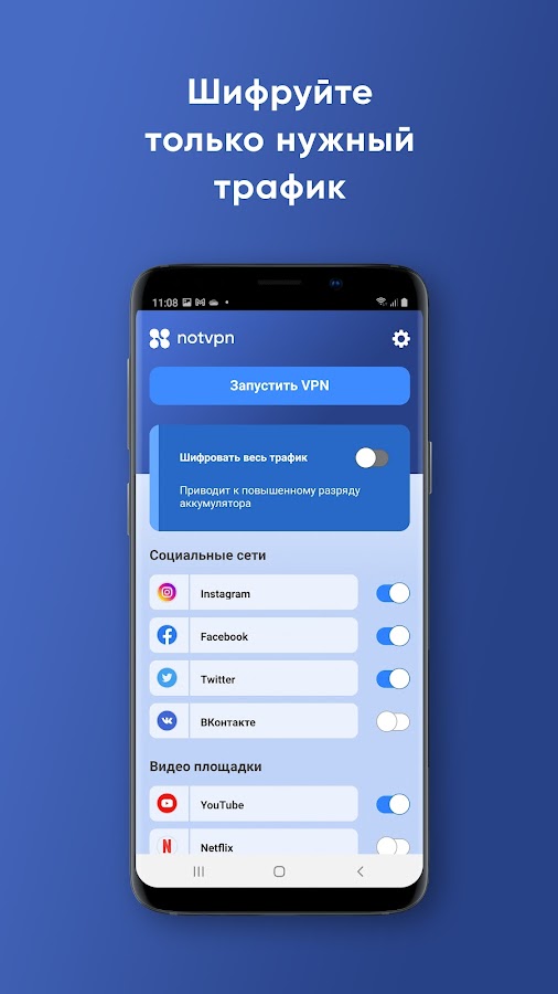 NotVPN безопасный, выборочно шифрует трафик и не сажает чрезмерно ваш аккумулятор.