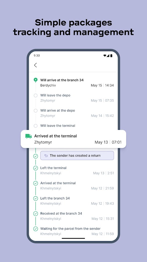 Створення та відстеження посилок по Україні та за кордон за допомогою мобільного застосунку ще зручніше. Усі деталі переміщення відправлення завжди зручно та легко переглядати у вашому телефоні. А ще тепер у кілька кліків можна перевірити статуси посилок, замовити та оплатити додаткові послуги.