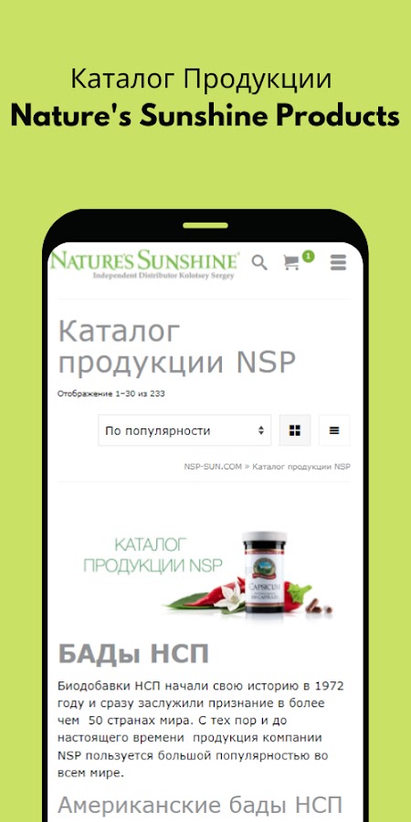 С помощью приложения nsp-sun.com Вы можете быстро и удобно оформить заказ продукции Nature’s Sunshine Products (NSP): экологически чистых биологически активных добавок к пище, высококачественных витаминов, косметики, средств гигиены полости рта и бытовой химии. У нас представлен полный каталог продукции NSP с возможностью покупки со скидкой по партнерской цене.