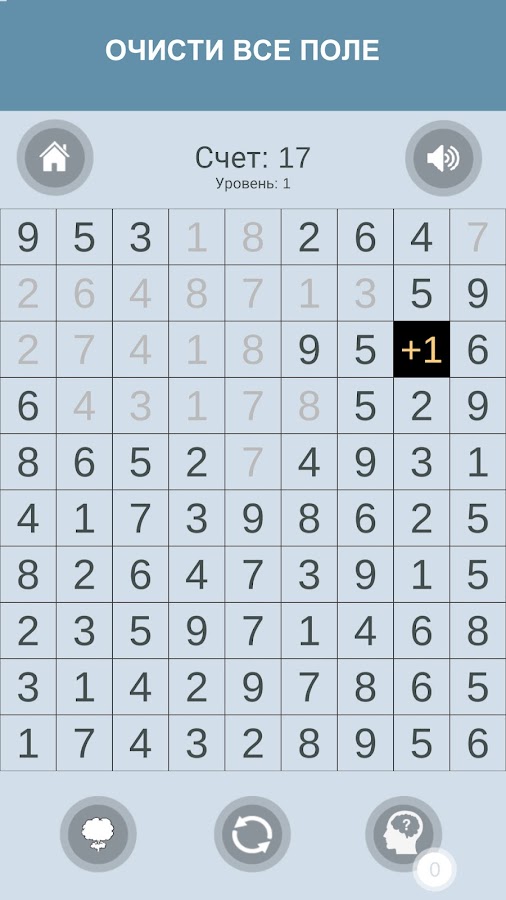 Суть цифровой головоломки — очистить игровое поле от всех чисел. Выбираете две одинаковые цифры, либо дающие в сумме 10, и они уничтожаются. После этого игрок переходит на следующий уровень. В игре есть подсказки.