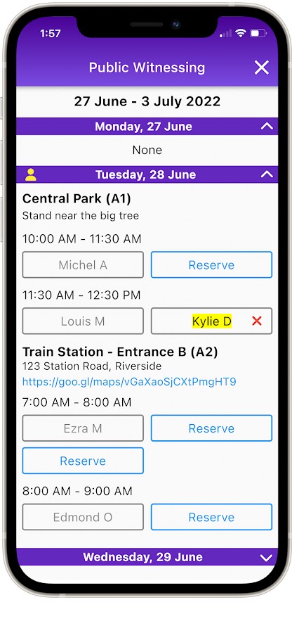 Просмотрите все предстоящие события, такие как «Служитель», «Охрана», «Звук», «Платформа», «Микрофоны», «Уборка Зала Царства», «Уход за садом» и многое другое. Возвещатели также могут отправлять собранию свои отчеты о проповедническом служении.