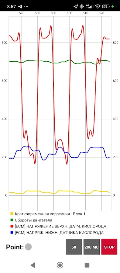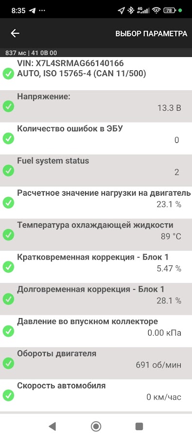 Данное приложение представляет собой диагностический сканер для автомобилей, работающих по интерфейсу OBDII. Оно отображает следующие данные: