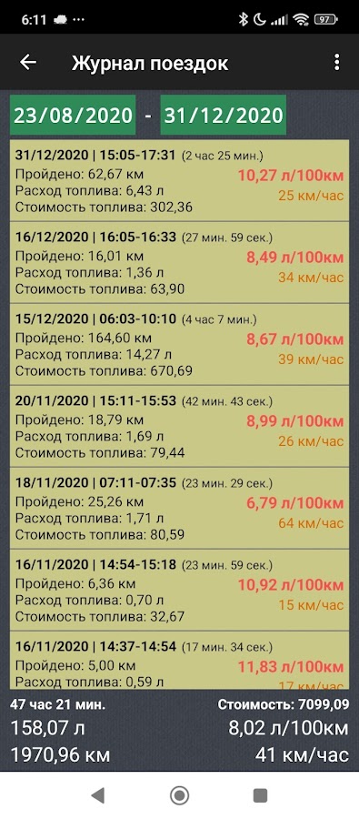 • Израсходованный бензин за поездку;