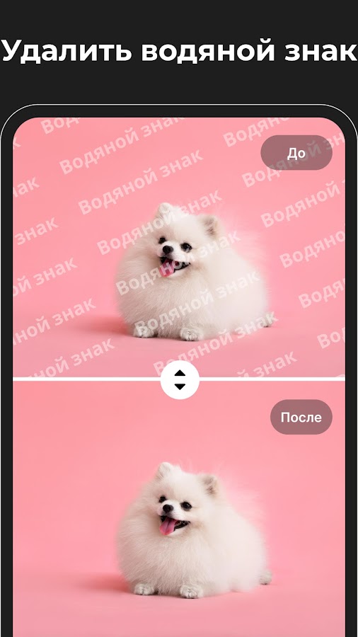 — Коррекция и ретушь: Точечная коррекция фото и тач ретач позволяют удалить водяной знак на фото, стереть ненужные элементы и обрезать фото по вашему желанию.