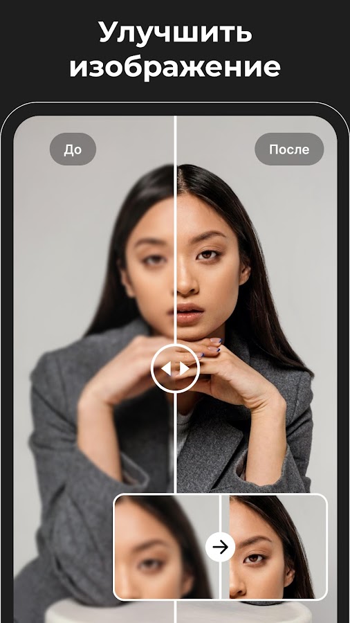— Улучшение качества: Улучшение качества фото с помощью искусственного интеллекта. Повышайте резкость и устраняйте дефекты, такие как прыщи убрать с фото, для получения идеального изображения.
