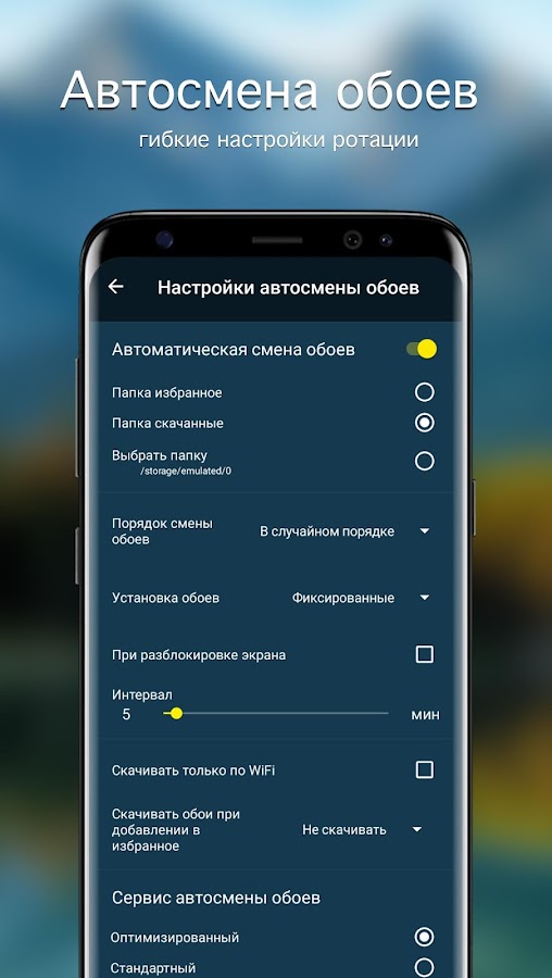 • Автоматическая смена заставки с заданным интервалом (живые обои гори)