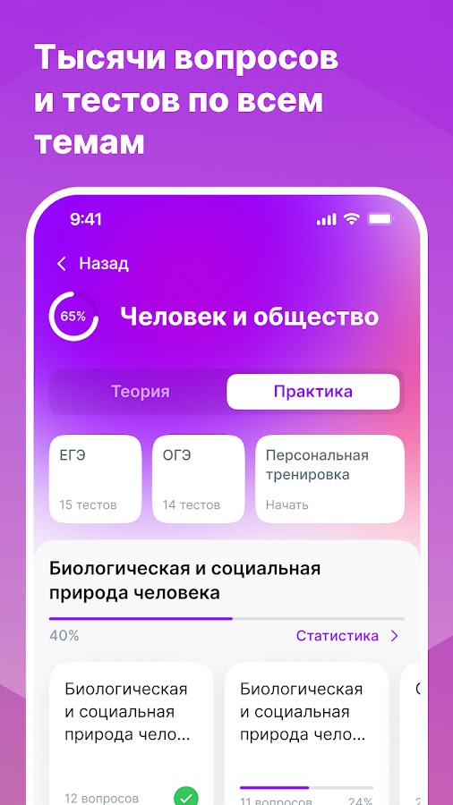 Приложение идеально подойдет для подготовки к ЕГЭ и ОГЭ по обществознанию. Вся теория разбита на темы и разделы, например, человек и общество, экономика и социальные отношения. Каждый текст и статью дополняет практика: задания и тесты для проверки и закрепления знаний.