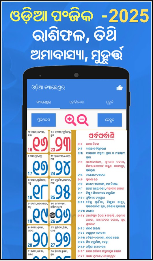 Правительственный календарь Одии: содержит как обычные праздники, так и правительственный календарь Одии, включая календарь Одии и Рашифал.