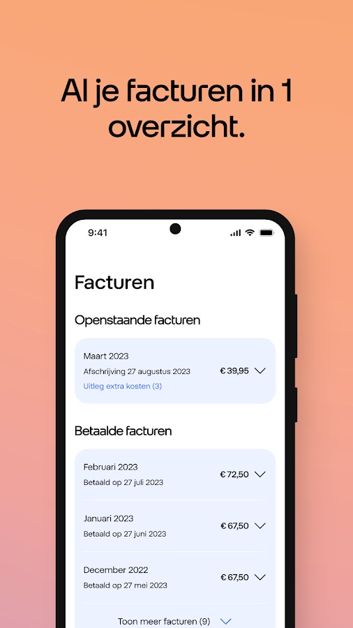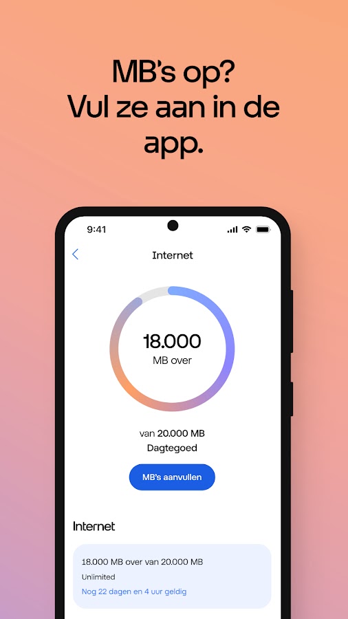Приложение Odido дает вам мгновенную информацию. Есть ли у вас подписка на домашнюю, мобильную, деловую или предоплаченную подписку? Хороший. С помощью этого приложения вы можете быстро проверить свое потребление, счета, подписку, кредит, покупки, счета и многое другое. Просто войдите в систему, используя свое имя пользователя и пароль Odido. У вас есть несколько подписок? Вы можете легко это добавить.