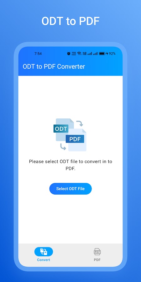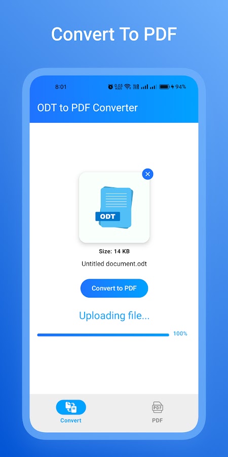Начните преобразование: после выбора файла odt нажмите кнопку «Преобразовать в PDF». Приложение быстро преобразует ваш файл в PDF. Индикатор выполнения будет держать вас в курсе. ⏳